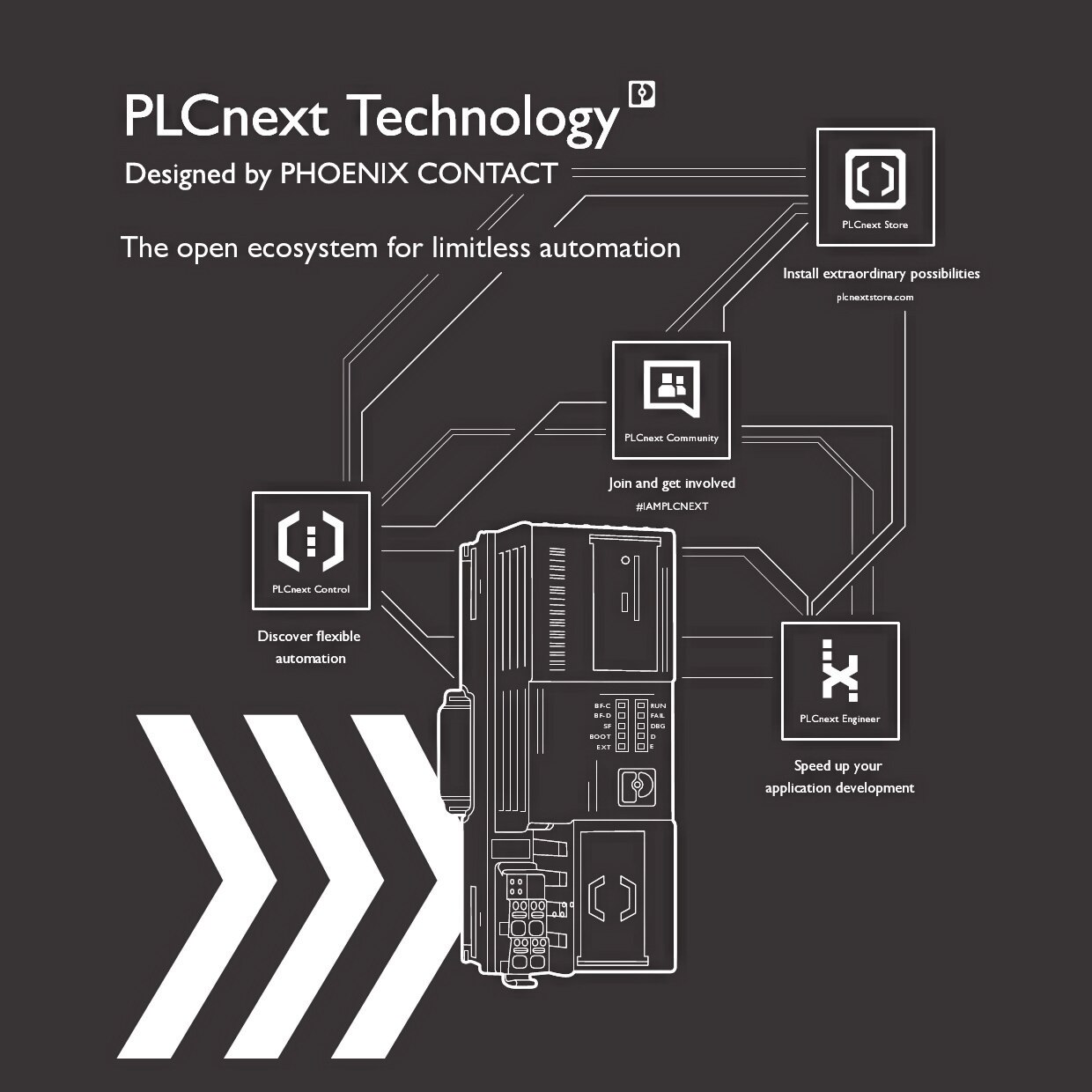Abbildung 3: Das PLCnext Technology Ökosystem besteht aus offener Hardware, modularer Engineering-Software, globaler Community und digitalem Software-Marktplatz. (Bildquelle: Phoenix Contact)