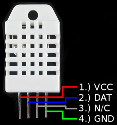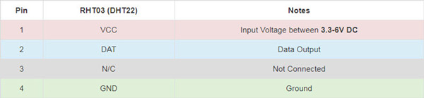 The pins of the RHT03 (DHT22) are labeled in the image below.