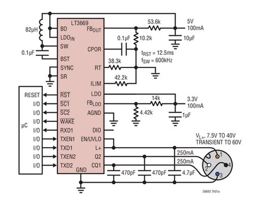 Der LT®3669 von Analog Devices ist ein industrieller Transceiver, der einen Abwärtsschaltregler und einen Linearregler mit niedrigem Dropout enthält. Wake-up-Erfassungsfunktionen, sowie ein programmierbarer Power-on-Reset-Timer sind ebenfalls enthalten. Die Strombegrenzung und die Anstiegsgeschwindigkeit der Transmitter sind für optimale EMV-Performance von außen einstellbar. Die Leitungstreiber können jeweils bis zu 250 mA Strom liefern/aufnehmen (Quelle/Senke) oder 500 mA, wenn sie miteinander verbunden sind, mit einer minimalen Restspannung von weniger als 2,1 V.