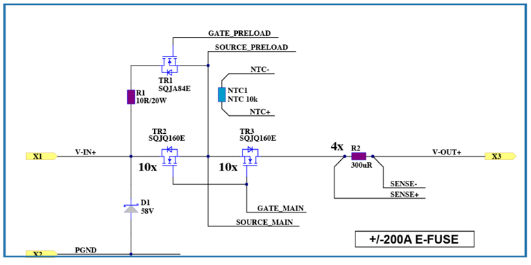 With the arrival of 48 V systems, a new method of safely connecting and disconnecting high current loads to the battery is required. This results in problems associated with arcing, which occurs when using mechanical relays. Therefore, an electronic fuse (eFuse) has been designed to switch loads up to 200 A at 48 V on a compact double-sided FR4 printed circuit board with passive cooling.