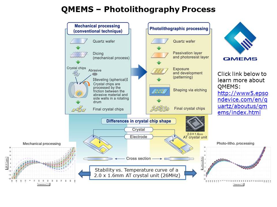 Epson’s Q MEMS photolithographic process enables the formation of precisely and uniformly shaped crystal chips. These crystal chips are used in sub-miniature crystal devices, oscillators, and sensors, offering outstanding temperature stability with minimal frequency variation from part to part.