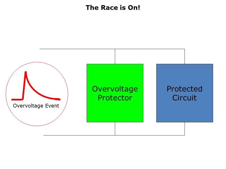 The basic strategy for any overvoltage protection scheme is to place the protector in parallel with the protected circuit. Voltage in an electrical circuit is analogous to pressure in a plumbing system. The overvoltage protector then functions as a kind of high pressure safety valve. The protected circuit is not designed to handle voltages above a certain level. Forcing these circuits into conduction with high voltages can damage them permanently. The overvoltage protector, on the other hand, is specifically designed to breakdown at a certain voltage level and conduct large amounts of current without sustaining damage. The challenge is to insure that the overvoltage protector will break down before the protected circuit and safely redirect the unwanted energy away from the protected circuit. In a sense, there is a race between the overvoltage protector and the protected circuit to breakdown in the face of a rising voltage and the overvoltage protector must be sure to win this race every time!