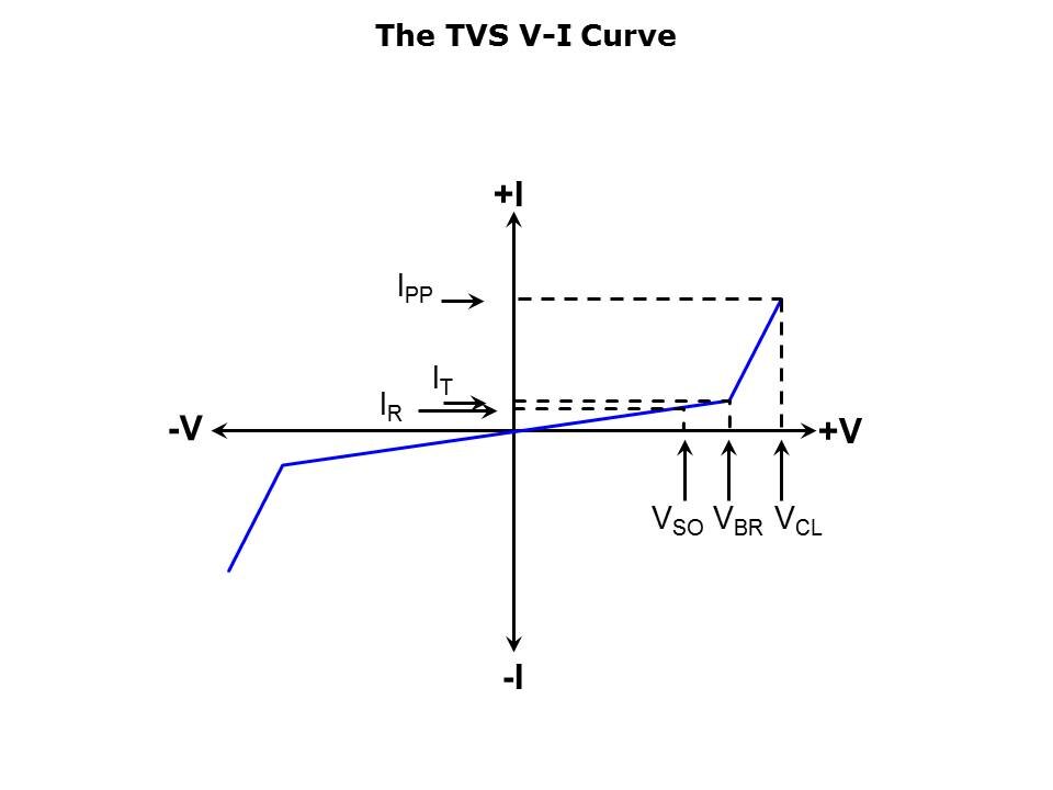 The next few parameters that will be discussed appear on what is known as a V-I curve. This characteristic curve displays the voltage and current relationships in a TVS diode. The voltage is shown horizontally and the resulting current is shown vertically. The Littelfuse line of high power TVS devices are bidirectional devices. That is, they have the same characteristic curve in the positive and the negative directions, so it does not matter which way they are inserted into the circuit. As can be seen from the graph, the left side of the curve is the mirror image of the right side, except of course that negative voltages will drive negative currents.