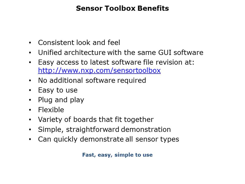 The toolbox is designed to maximize ease-of-use. The boards are designed to be plug-and-play, with the software able to identify which board is plugged in and access the appropriate application. The focus of the design is to enable fast, easy, simple demonstrations for sensor types that NXP offers.