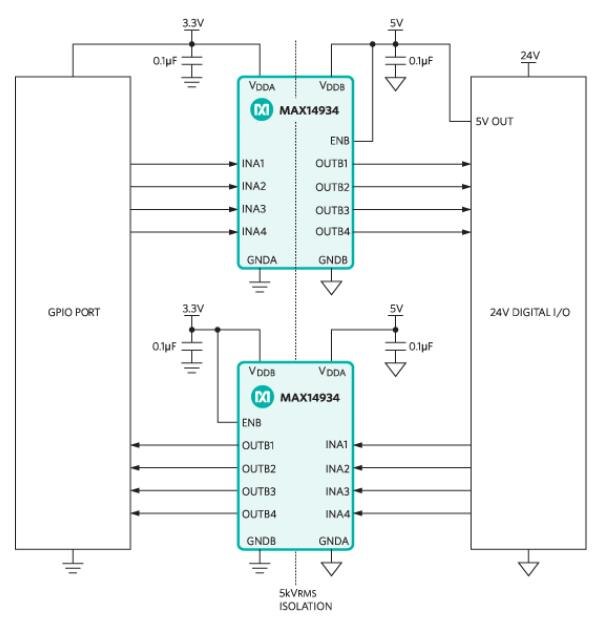 Analog Devices' MAX14934/35 is a family of four-channel, 5 kV digital isolators utilizing Analog Devices' proprietary process technology. The MAX14934/35 family transfers digital signals between circuits with different power domains at ambient temperatures up to +125°C.