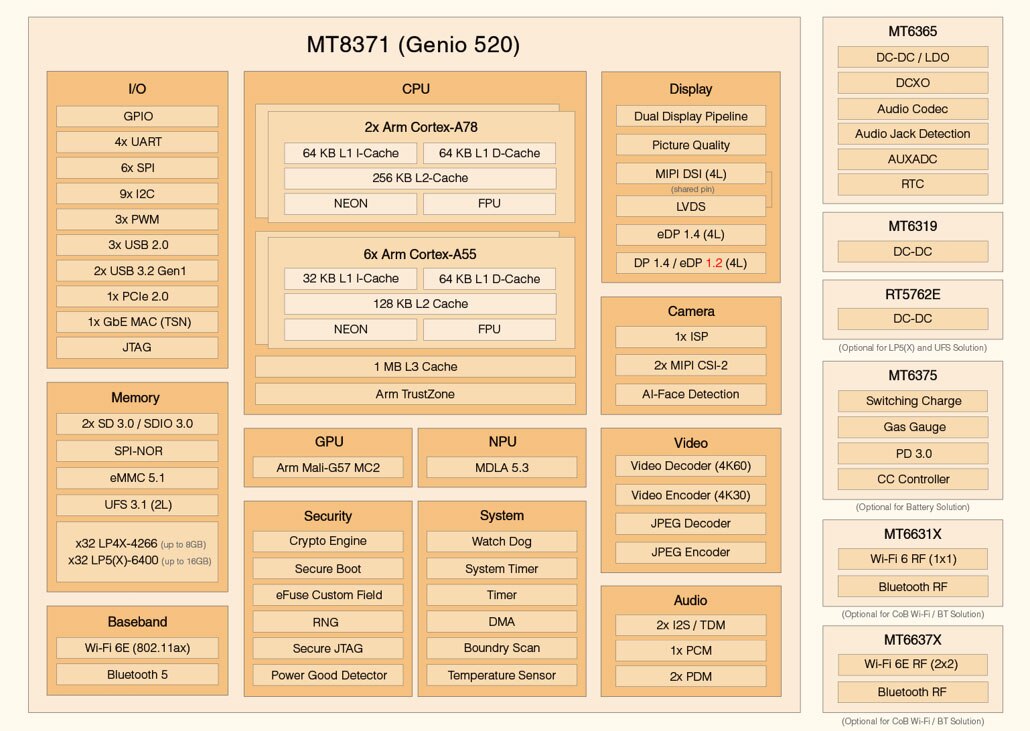 - Pre-integrated MediaTek Wi-Fi® 6/6E solutions, with also optional Wi-Fi 6, Wi-Fi 7 and 5G RedCap modules support