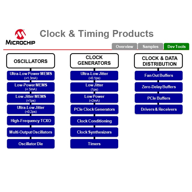 Offering the industry’s most reliable and robust clock and oscillator family by leveraging cutting-edge MEMS technology, advanced Phase-locked Loop (PLL) design and semiconductor packaging. Microchip also provides a vast array of automotive-grade clock generators and buffers.