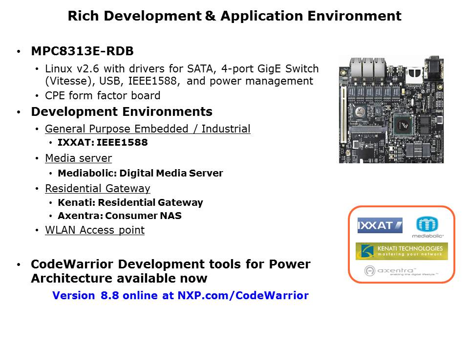 The MPC8313E Reference Design Board (RDB) includes a printed circuit board (PCB) assembly plus a software board support package (BSP) distributed in a CD image. Development environments include general purpose embedded or industrial, media servers, residential gateways, and WLAN access points. The beta release of the CodeWarrior 8.8 Development Tools Suite is available now on the NXP CodeWarrior website.