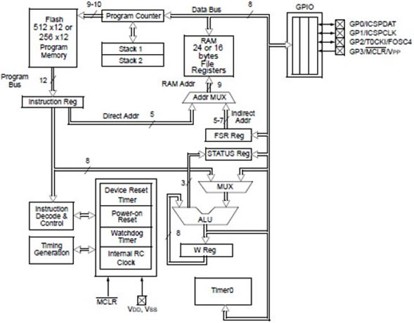 Figure 1 shows a block diagram of the 4-MHz Microchip PIC10F20x family. Flash program memory ranges from 256 to 512 words, and the MCUs include 16 or 24 bytes of SRAM. All of the products integrate an 8-bit timer and some include a comparator as well.