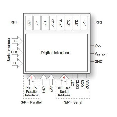 - Déphaseur 8 bits pleine gamme de 358,6° ; 180°, 90°, 45°, 22,5°, 11,2°, 5,6°, 2,8° et 1,4° bits