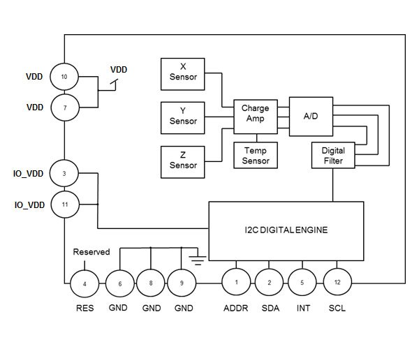 L'accéléromètre est fourni dans un boîtier LGA en plastique de 2 mm x 2 mm x 0,9 mm fonctionnant à partir d'une alimentation de 1,71 VCC à 3,6 VCC. Des régulateurs de tension sont utilisés pour maintenir des tensions de fonctionnement internes constantes sur la plage de tensions d'alimentation d'entrée. Cela résulte en des caractéristiques de fonctionnement stables sur la plage de tensions d'alimentation d'entrée et en une erreur ratiométrique presque indétectable. Le protocole numérique I2C est utilisé pour communiquer avec la puce pour configurer le composant et surveiller les sorties.