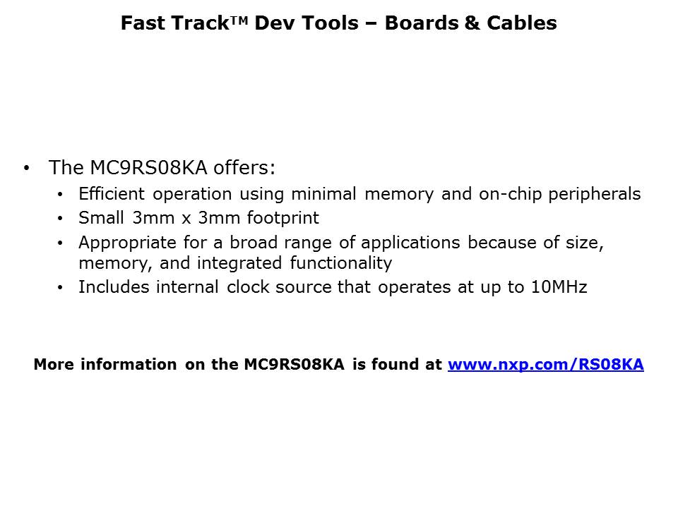 The MC9RS08KA was specifically created for efficient operation using minimal memory and on-chip peripherals. It has a small footprint and is appropriate for a broad range of applications. The KA comes with an internal clock source that can operate up to 10MHz with 2% deviation over the full temperature and voltage range. NXP offers support with quick reference guides, code, and documentation in a variety of forms on the RS08KA website.