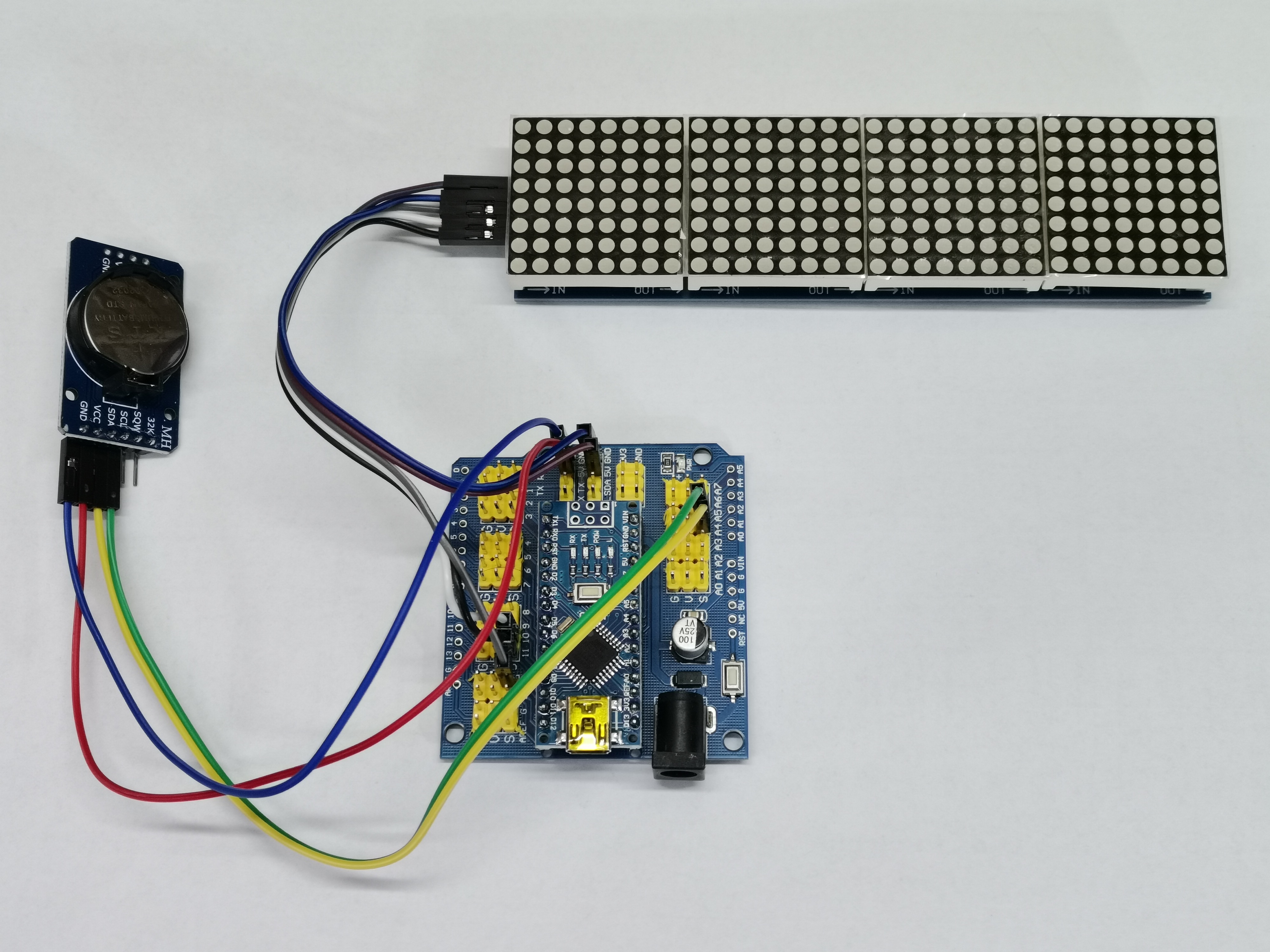 As I mentioned the clock is really simple to build, and consists of several components: - Arduino nano microcontroller - DS3231 Realtime clock module - 8x32 Led matrix module - and two buttons.