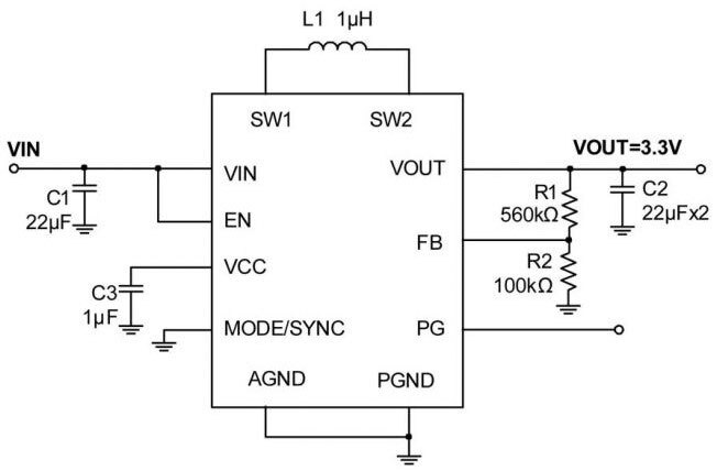- Capacità di carico 3,3 V/2 A da un'alimentazione in ingresso da 2,5 V a 5,5 V