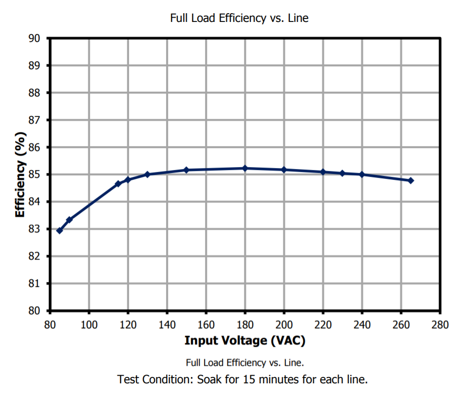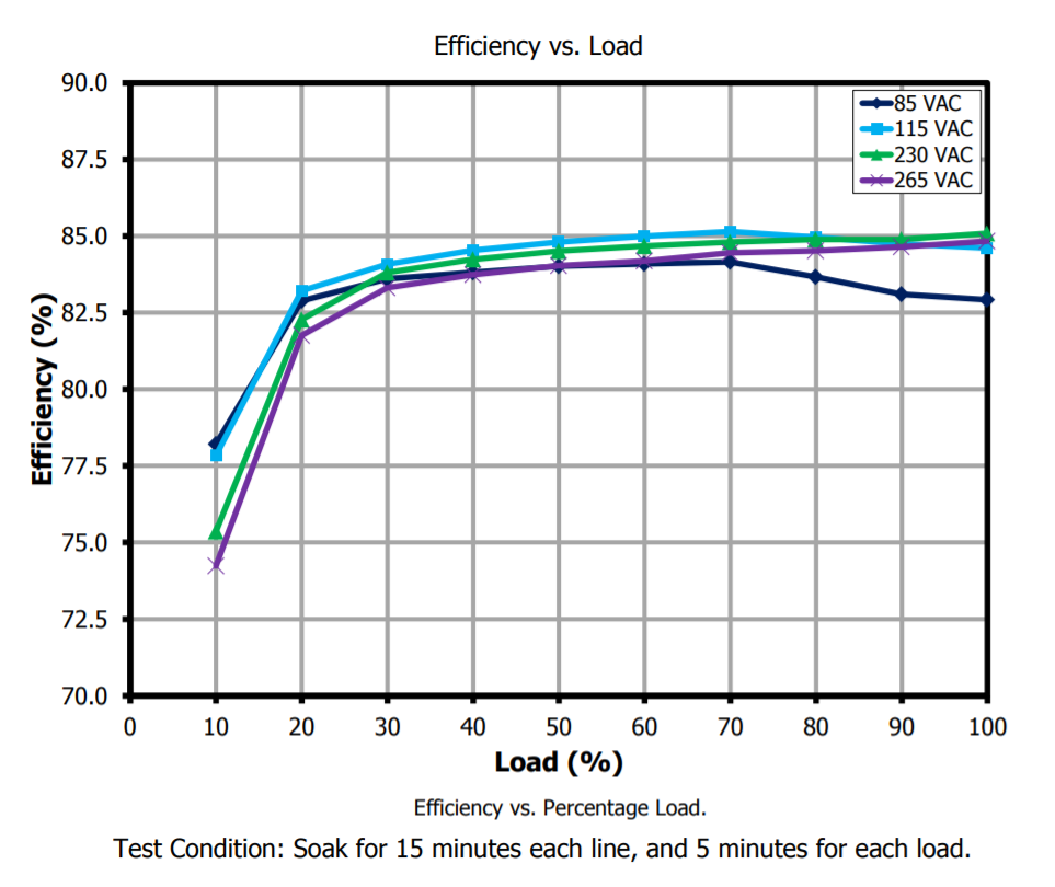 >83%, 115 VAC in, 12V @ 2.4 ~ 12 W >82.5%, 85 VAC in, 12V @ 2.4 ~ 12 W >82%, 265 VAC in, 12V @ 2.4 ~ 12 W |