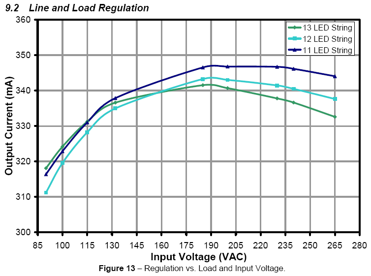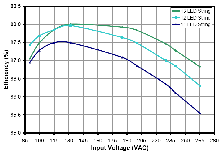 >87%, 115V in, 13 LEDs @ 330 mA >87%, 115V in, 11 LEDs @ 330 mA >86%, 230V in, 11 LEDs @ 330 mA |