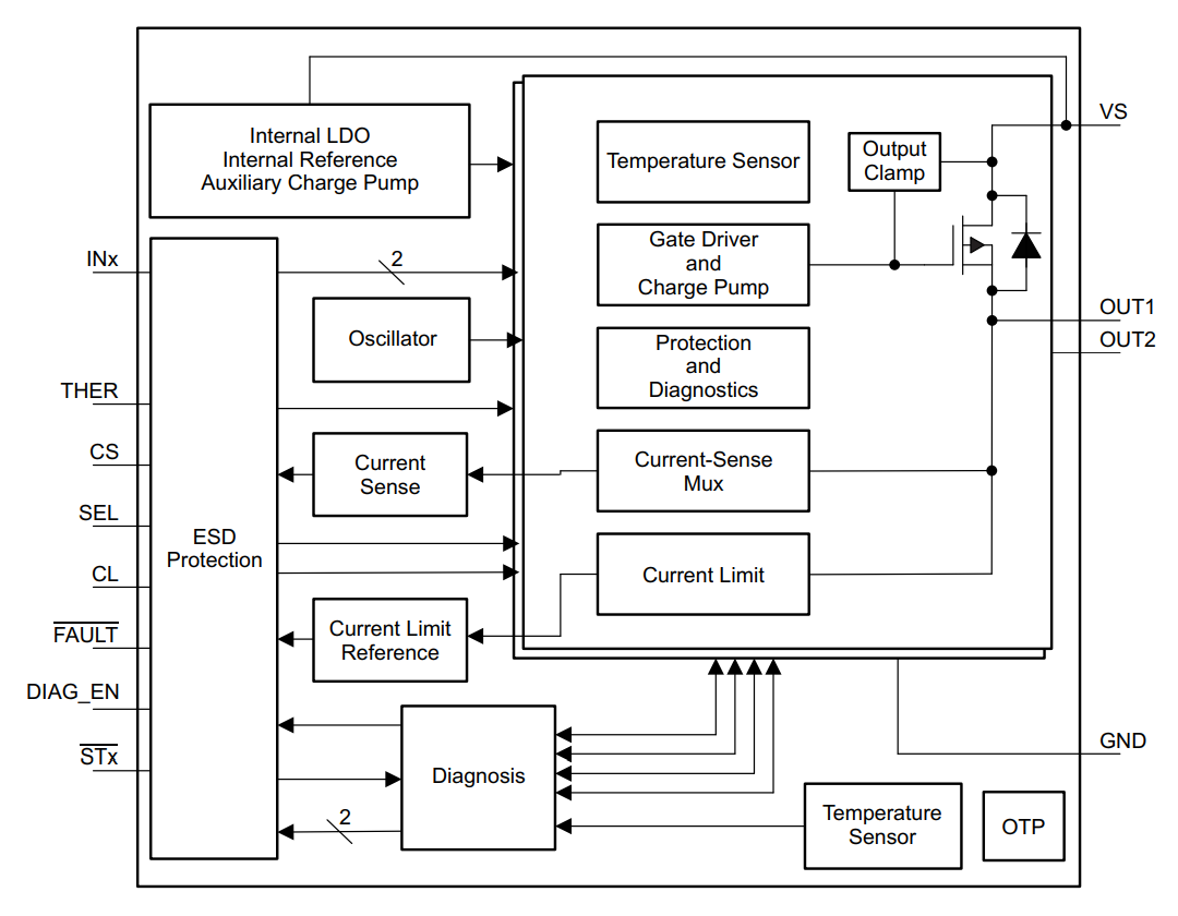The TPS2H160-Q1 family is a fully protected dual-channel high-side power switch, with integrated NMOS power FET and charge pump. Full diagnostics and high-accuracy current-sense features enable intelligent control of the load. The device diagnostic reporting has two versions to support both digital status output and analog current sense reports. The diagnostics can be disabled for multiplexing the sense pin between different devices. Thermal shutdown behaviors as latch off or auto-retry are internally fixed in the part. External programmable current limit improves the reliability of the system by limiting the inrush or overload current.