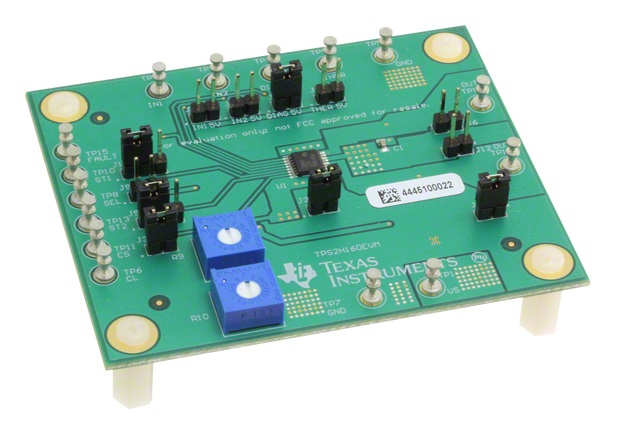 Texas Instruments TPS2H160EVM evaluation module contains a TPS2H160-Q1 integrated circuit (IC), supporting dual channel high side switch application. The purpose of this EVM is to facilitate evaluation of the TPS2H160-Q1 for resistive, capacitive, inductive load.